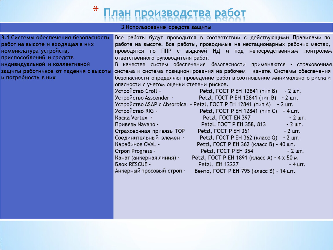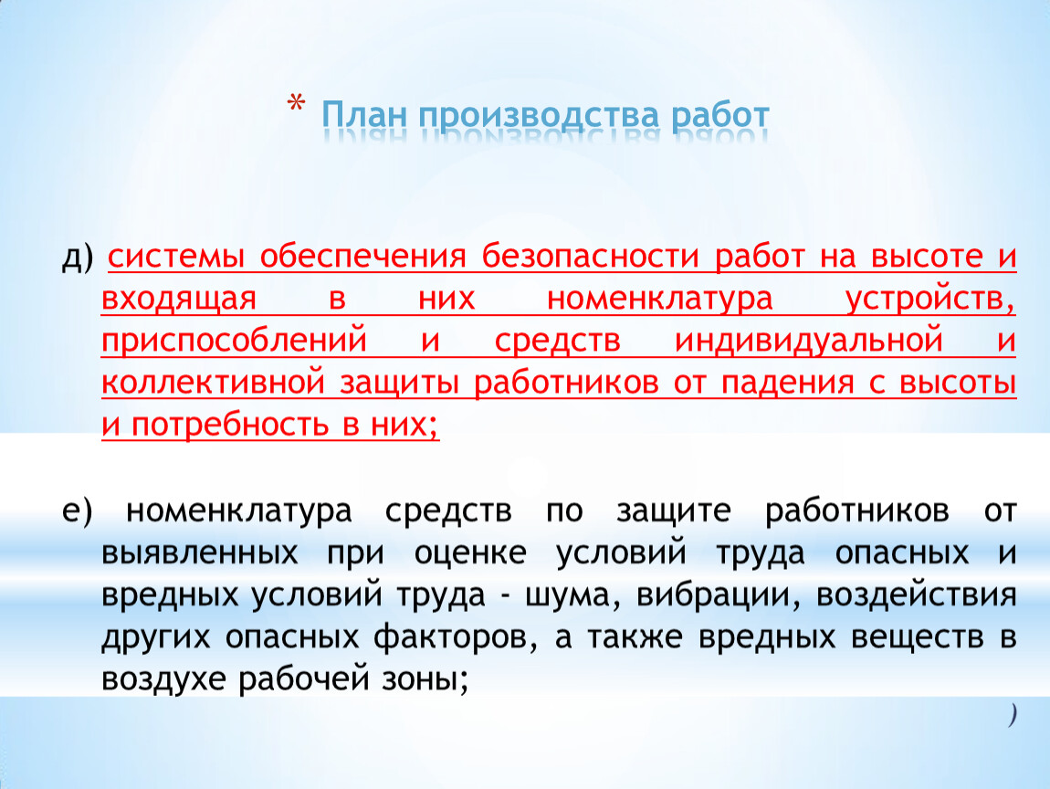 д) системы обеспечения безопасности работ на высоте и входящая в них номенклатура устройств, приспособлений и средств индивидуальной и коллективной защиты работников от падения с высоты и потребность в них;
