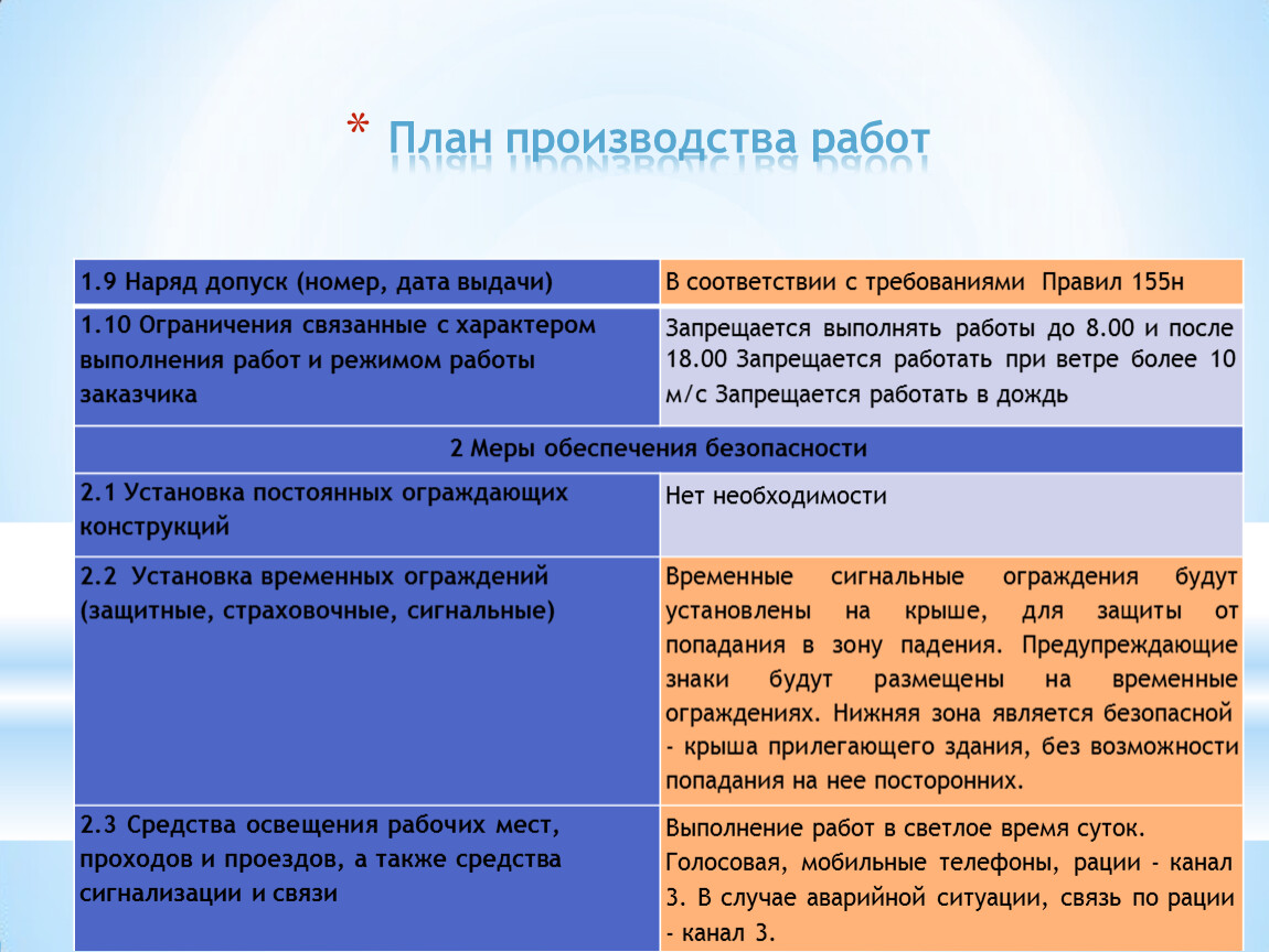 7.2 Дополнительные мероприятия, | Во время проведения работ, в рабочей зоне смежные работы производится не будут, доступ посторонних исключен. |