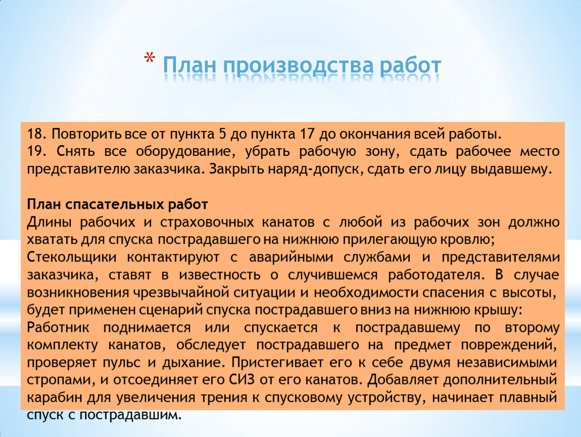 Длины рабочих и страховочных канатов с любой из рабочих зон должно хватать для спуска пострадавшего на нижнюю прилегающую кровлю; Стекольщики контактируют с аварийными службами и представителями заказчика, ставят в известность о случившемся работодателя. В случае возникновения чрезвычайной ситуации и необходимости спасения с высоты, будет применен сценарий спуска пострадавшего вниз на нижнюю крышу: Работник поднимается или спускается к пострадавшему по второму комплекту канатов, обследует пострадавшего на предмет повреждений, проверяет пульс и дыхание. Пристегивает его к себе двумя независимыми стропами, и отсоединяет его СИЗ от его канатов. Добавляет дополнительный карабин для увеличения трения к спусковому устройству, начинает плавный спуск с пострадавшим.