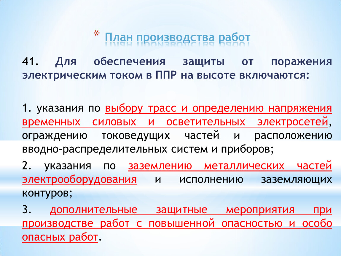 Для обеспечения защиты от поражения электрическим током в ППР на высоте включаются: