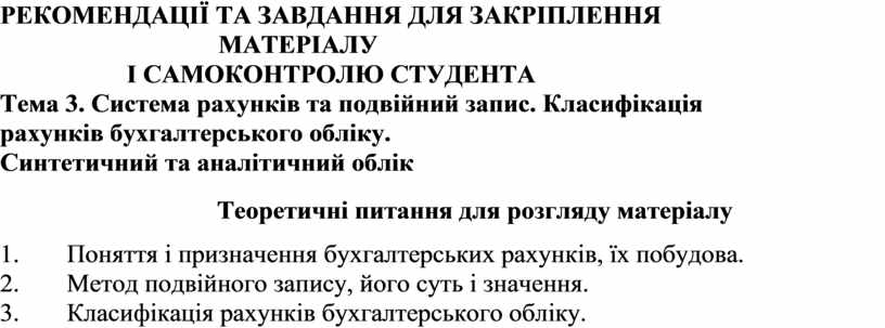 Тема 3. Система рахунків та подвійний запис. Класифікація рахунків бухгалтерського обліку.