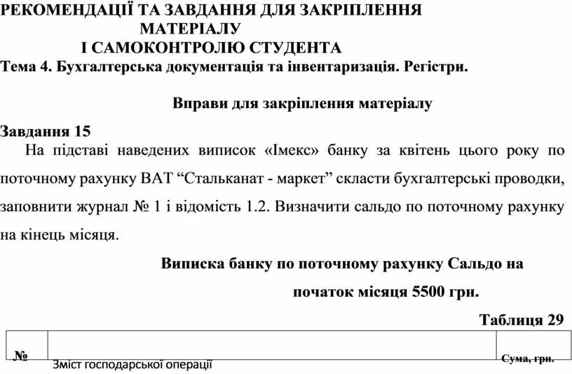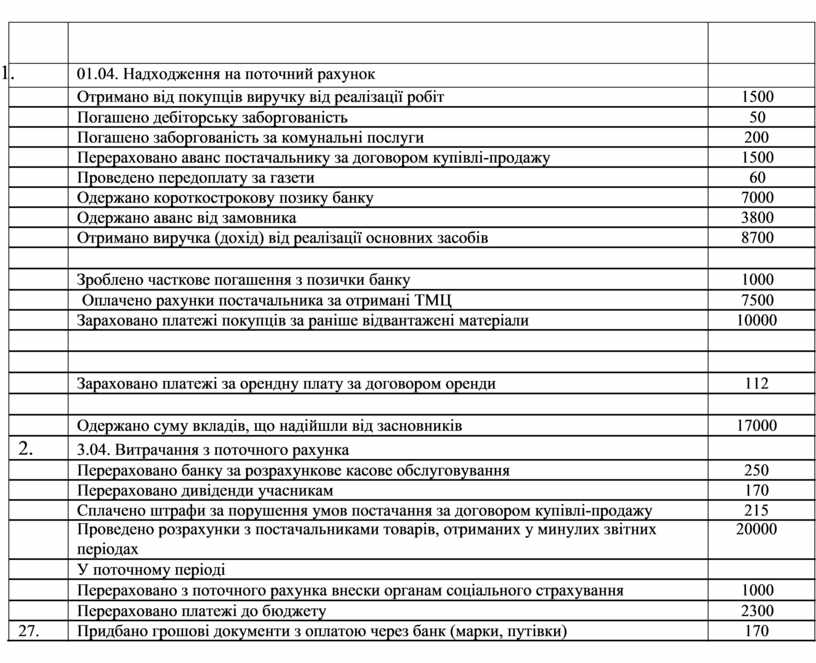 Виписка банку по поточному рахунку Сальдо на початок місяця 5500 грн.