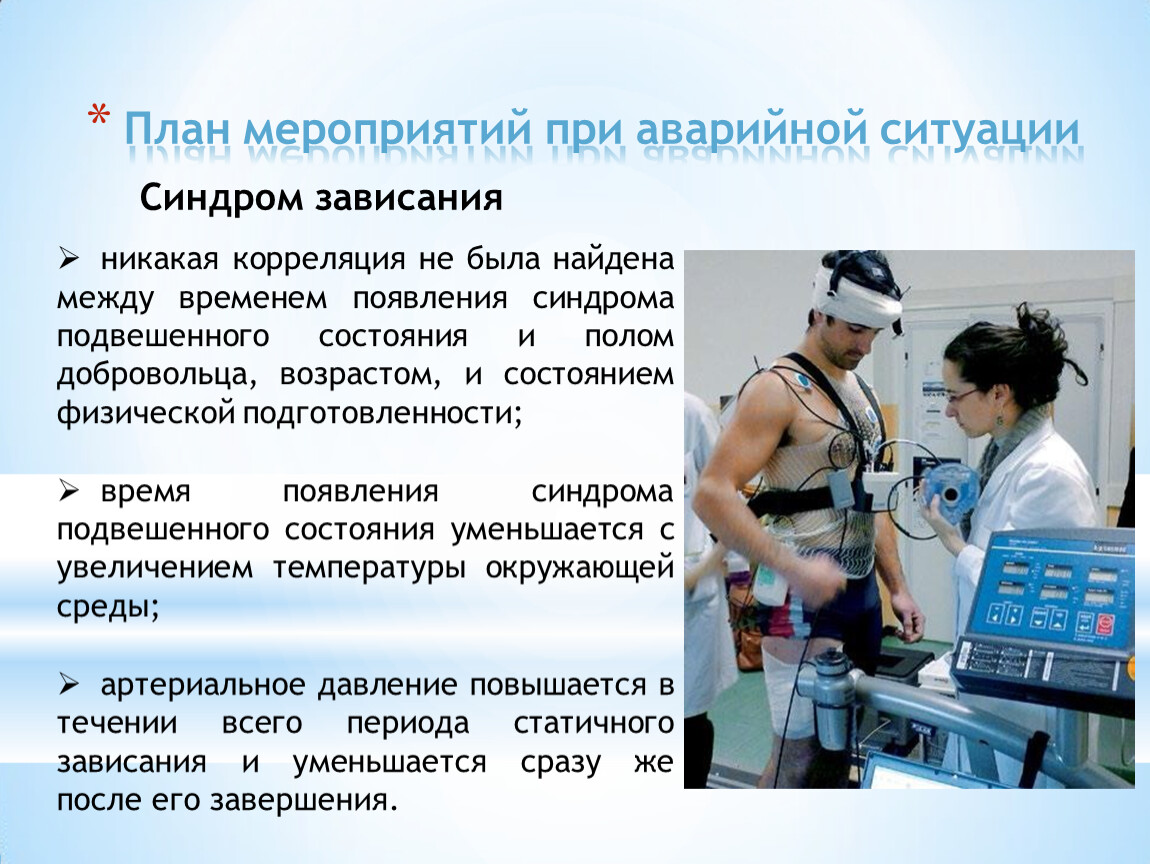 никакая корреляция не была найдена между временем появления синдрома подвешенного состояния и полом добровольца, возрастом, и состоянием физической подготовленности;