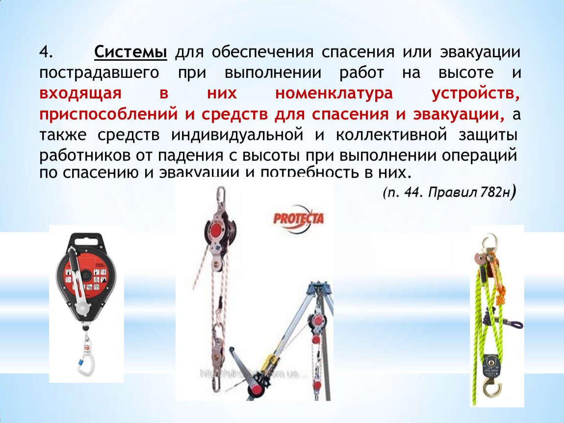4. Системы для обеспечения спасения или эвакуации пострадавшего при выполнении работ на высоте и входящая в них номенклатура устройств, приспособлений и средств для спасения и эвакуации, а также средств индивидуальной и коллективной защиты