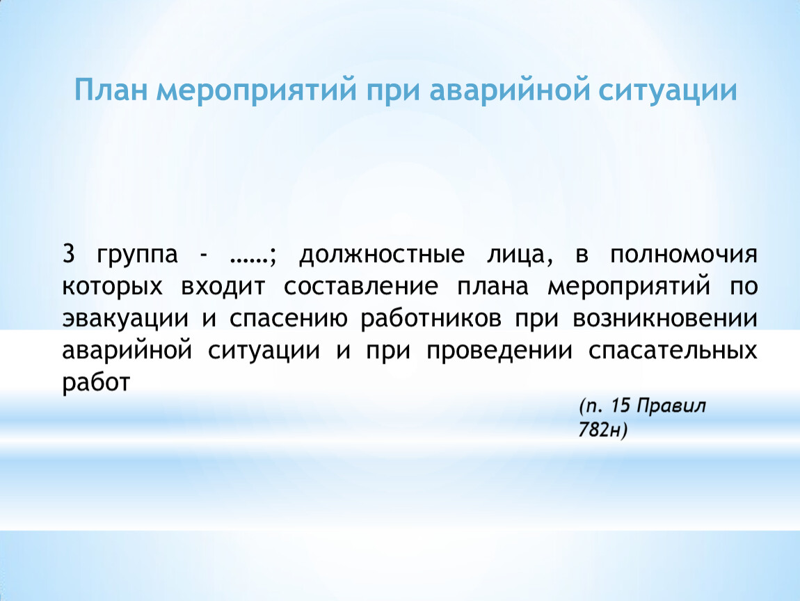 3 группа - ……; должностные лица, в полномочия которых входит составление плана мероприятий по эвакуации и спасению работников при возникновении аварийной ситуации и при проведении спасательных работ