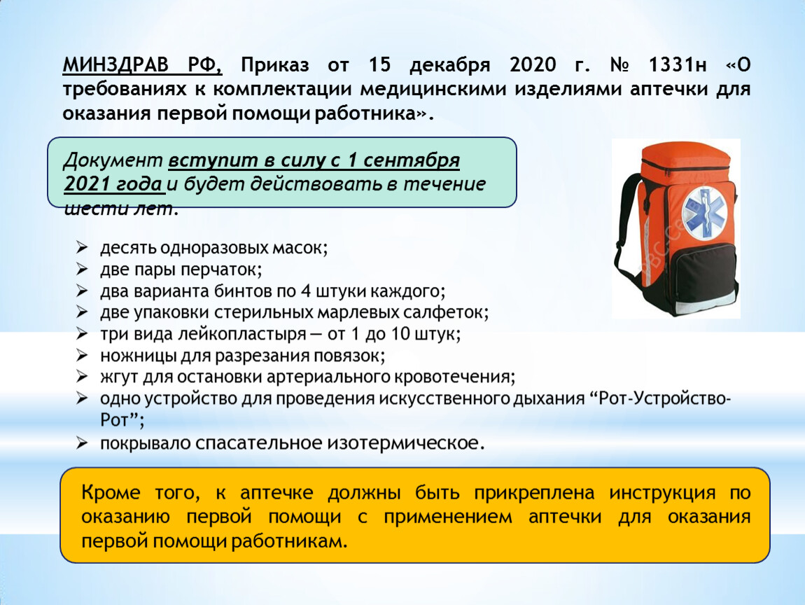 МИНЗДРАВ РФ, Приказ от 15 декабря 2020 г. № 1331н «О требованиях к комплектации медицинскими изделиями аптечки для оказания первой помощи работника».