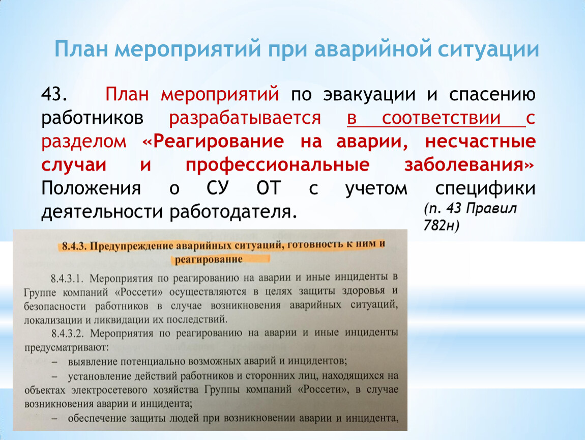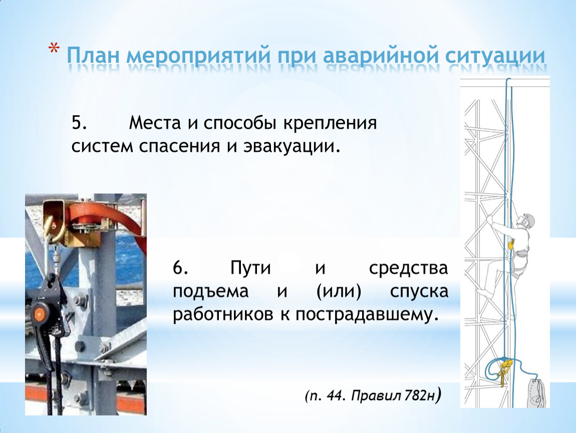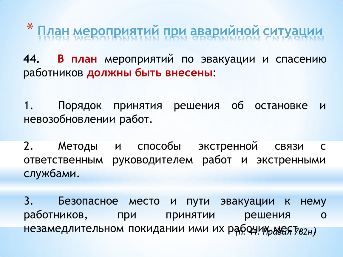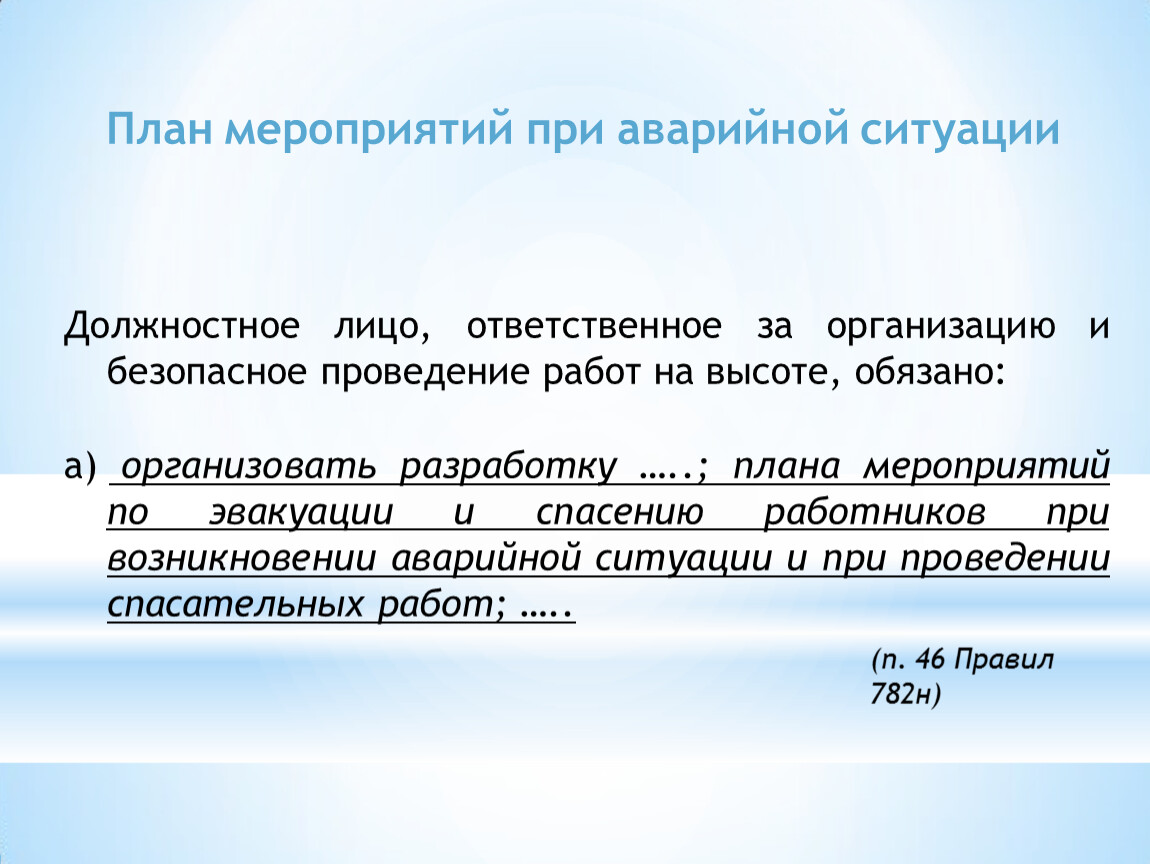 а) организовать разработку …..; плана мероприятий по эвакуации и спасению работников при возникновении аварийной ситуации и при проведении спасательных работ; …..