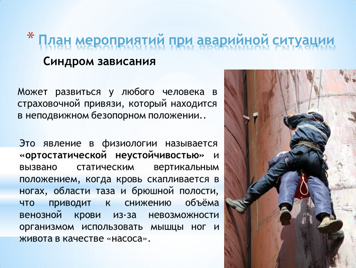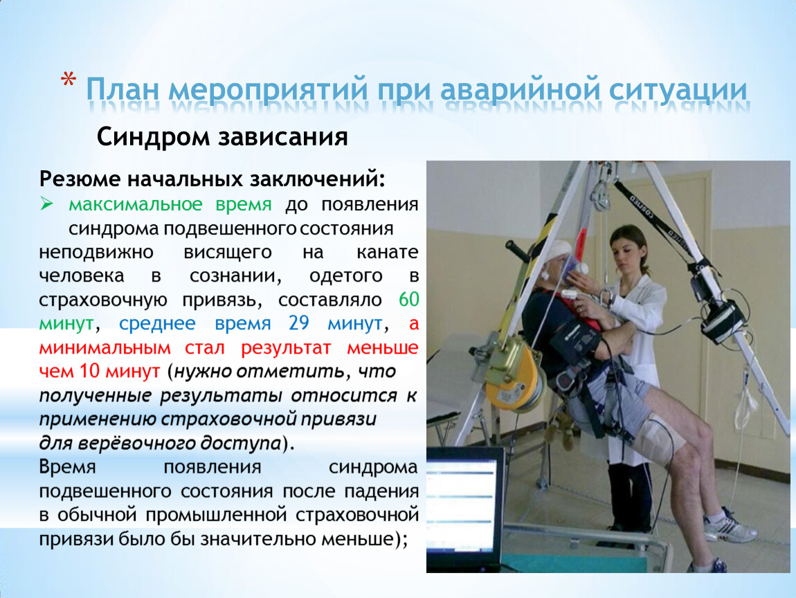 Время появления синдрома подвешенного состояния после падения в обычной промышленной страховочной привязи было бы значительно меньше);