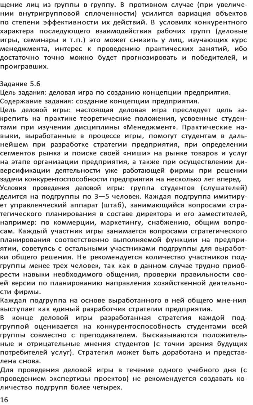 Цель деловой игры: настоящая деловая игра преследует цель за-крепить на практике теоретические положения, усвоенные студен-тами при изучении дисциплины «Менеджмент». Практические на-выки, выработанные в процессе игры, помогут студентам в даль-нейшем при разработке стратегии предприятия, при определении сегментов рынка и поиске своей «ниши» на рынке товаров и услуг на этапе организации предприятия, а также при осуществлении ди-версификации деятельности уже работающей фирмы при решении задачи конкурентоспособности предприятия на несколько лет вперед.