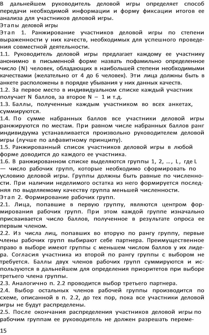 1.6. В ранжированном списке выделяются группы 1, 2, …, L, где L — число рабочих групп, которые необходимо сформировать по условию деловой игры. Группы должны быть равные по численно-сти. При наличии неделимого остатка из него формируется послед-няя по выделяемому качеству группа меньшей численности.