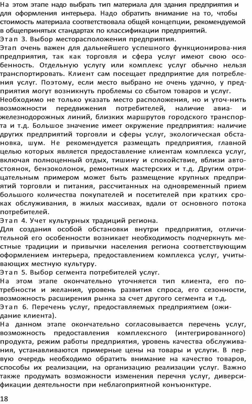 Этап очень важен для дальнейшего успешного функционирова-ния предприятия, так как торговля и сфера услуг имеют свою осо-бенность. Отдельную услугу или комплекс услуг обычно нельзя транспортировать. Клиент сам посещает предприятие для потребле-ния услуг. Поэтому, если место выбрано не очень удачно, у пред-приятия могут возникнуть проблемы со сбытом товаров и услуг.