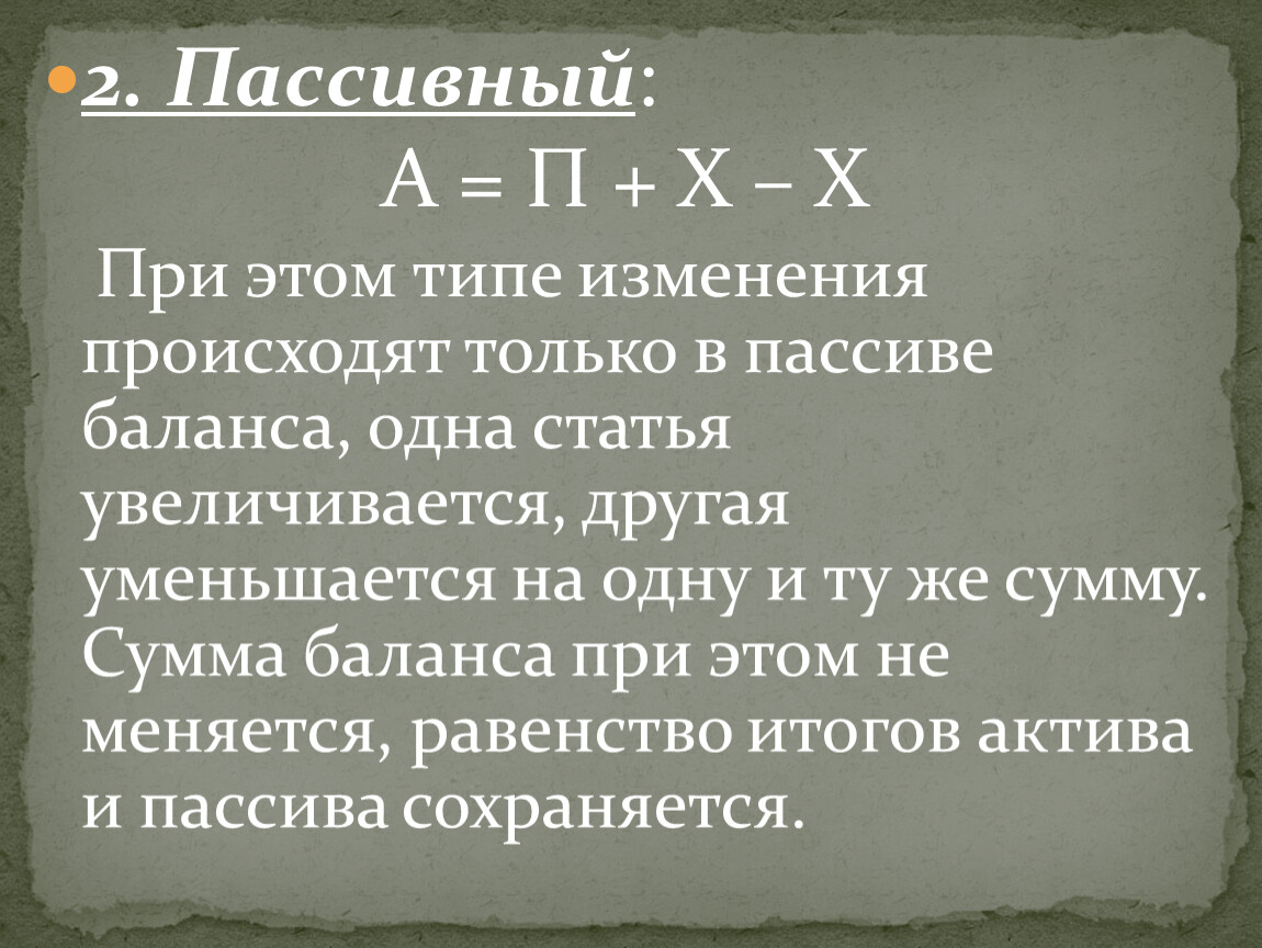При этом типе изменения происходят только в пассиве баланса, одна статья увеличивается, другая уменьшается на одну и ту же сумму. Сумма баланса при этом не меняется, равенство итогов актива и пассива сохраняется.