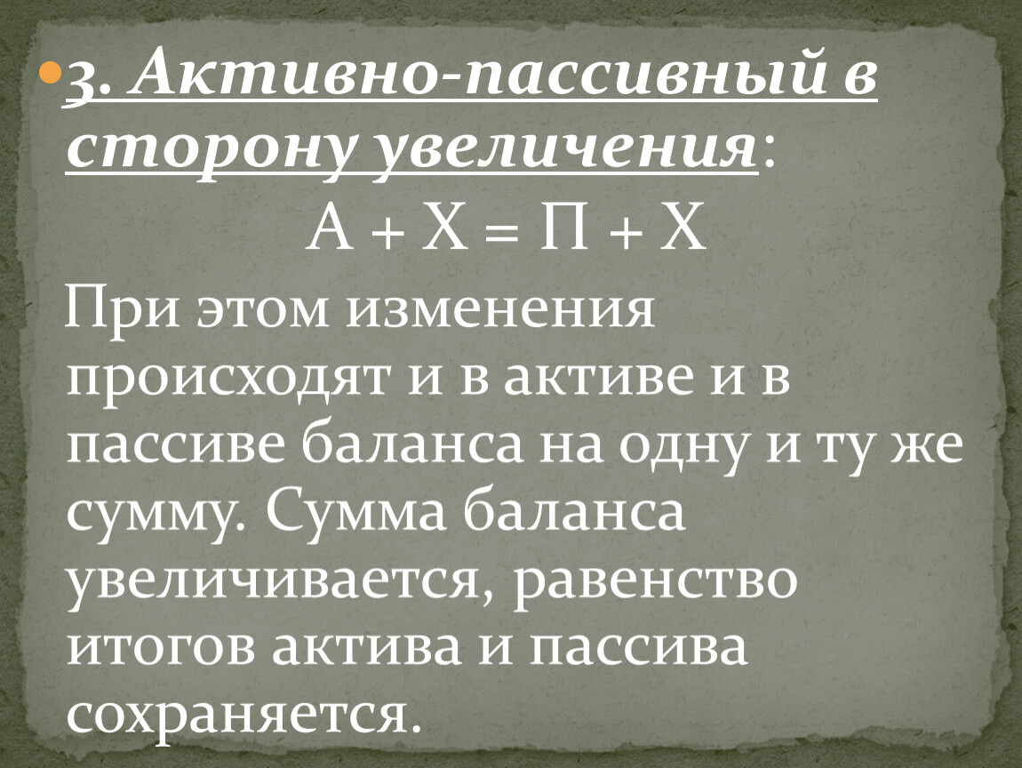 При этом изменения происходят и в активе и в пассиве баланса на одну и ту же сумму. Сумма баланса увеличивается, равенство итогов актива и пассива сохраняется.