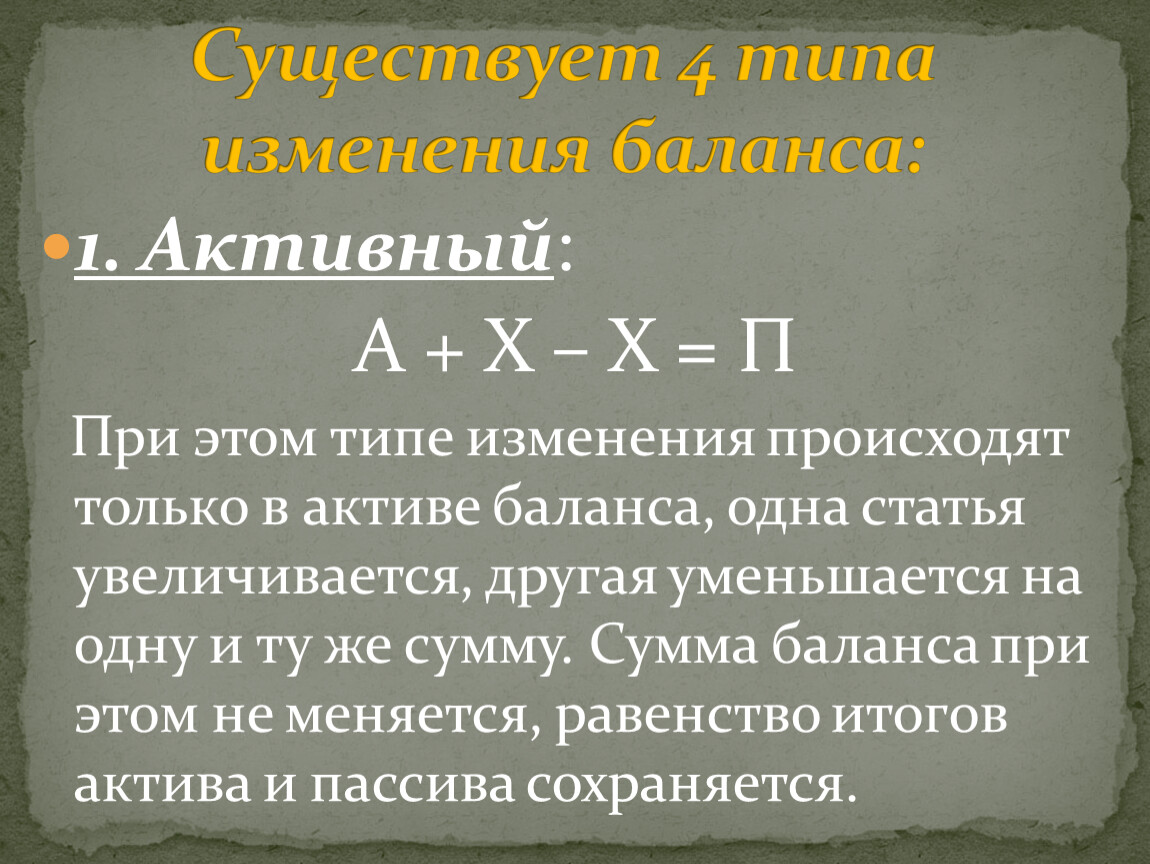 При этом типе изменения происходят только в активе баланса, одна статья увеличивается, другая уменьшается на одну и ту же сумму. Сумма баланса при этом не меняется, равенство итогов актива и пассива сохраняется.