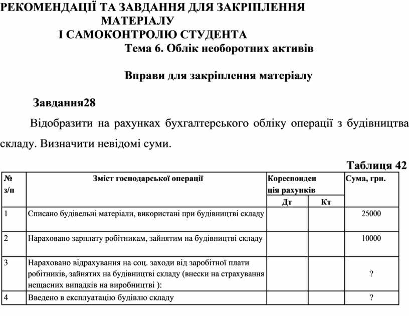 Відобразити на рахунках бухгалтерського обліку операції з будівництва складу. Визначити невідомі суми.