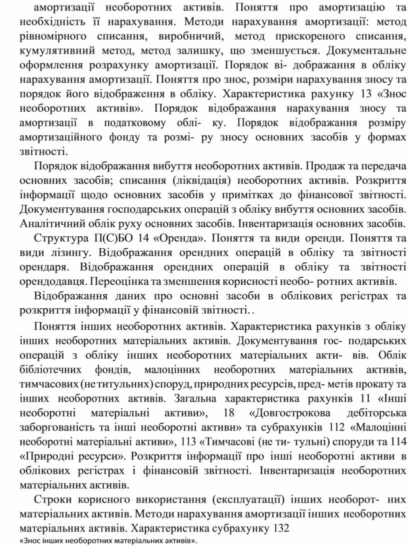 Сутність, об’єкт та період амортизації. Методи амортизації не- оборотних активів у відповідності по П(С)БО 7 «Основні засоби». Облік амортизації. Перегляд строку корисного використання та ме- тоду амортизації необоротних активів. Поняття про амортизацію та необхідність її нарахування. Методи нарахування амортизації: метод рівномірного списання, виробничий, метод прискореного списання, кумулятивний метод, метод залишку, що зменшується. Документальне оформлення розрахунку амортизації. Порядок ві- дображання в обліку нарахування амортизації. Поняття про знос, розміри нарахування зносу та порядок його відображення в обліку. Характеристика рахунку 13 «Знос необоротних активів». Порядок відображання нарахування зносу та амортизації в податковому облі- ку. Порядок відображання розміру амортизаційного фонду та розмі- ру зносу основних засобів у формах звітності.
