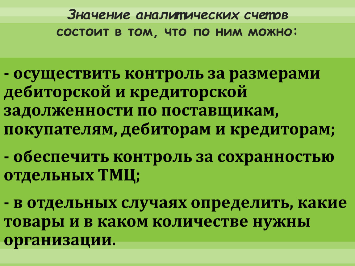 Счета аналитического учета детализируют содержание синтетического счета. На аналитических счетах учет ведется как в денежном, так и в натуральном измерителе.