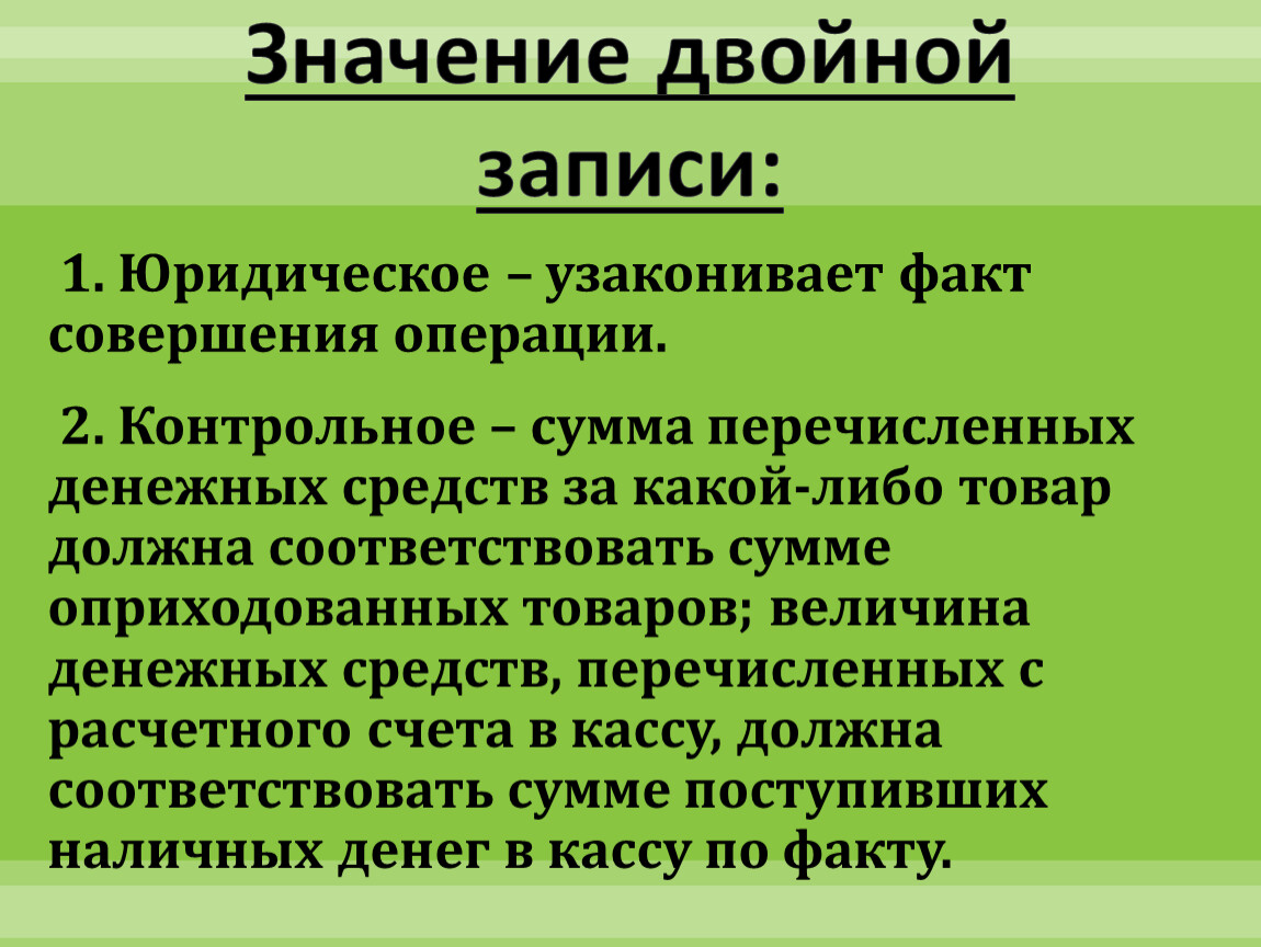 2. Контрольное – сумма перечисленных денежных средств за какой-либо товар должна соответствовать сумме оприходованных товаров; величина денежных средств, перечисленных с расчетного счета в кассу, должна соответствовать сумме поступивших наличных денег в кассу по факту.