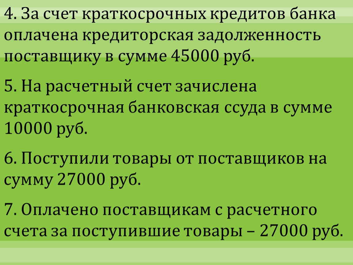 4. За счет краткосрочных кредитов банка оплачена кредиторская задолженность поставщику в сумме 45000 руб.