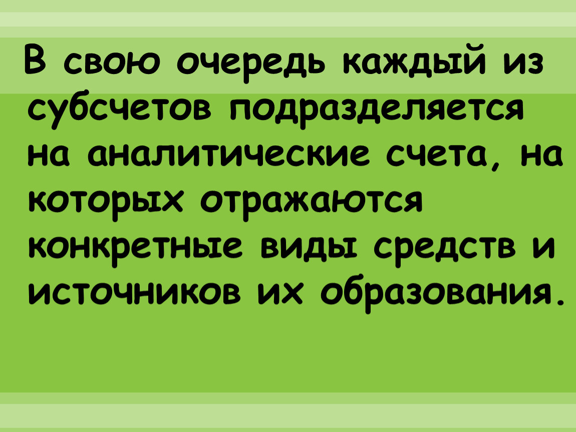 В свою очередь каждый из субсчетов подразделяется на аналитические счета, на которых отражаются конкретные виды средств и источников их образования.
