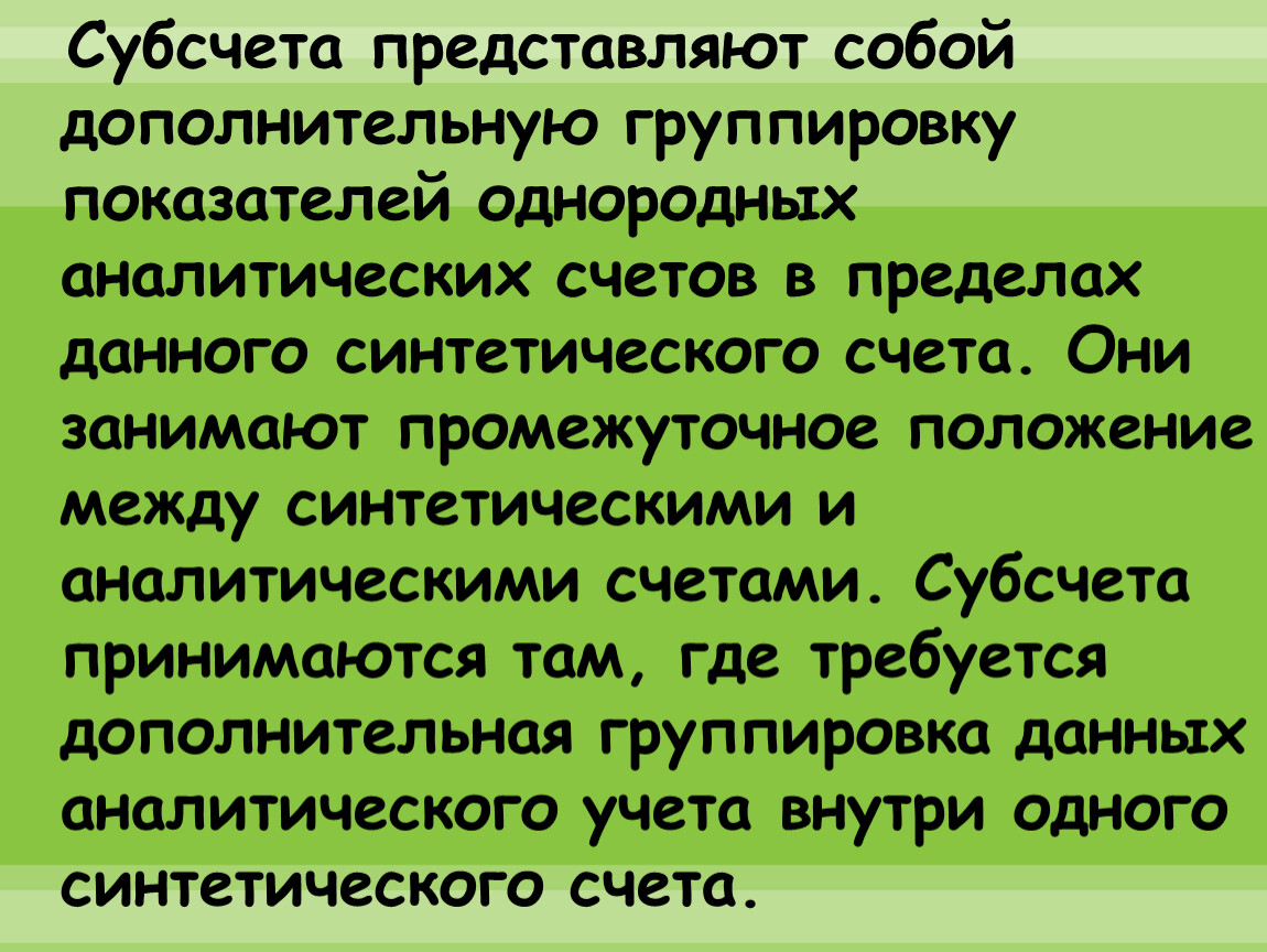 Субсчета представляют собой дополнительную группировку показателей однородных аналитических счетов в пределах данного синтетического счета. Они занимают промежуточное положение между синтетическими и аналитическими счетами. Субсчета принимаются там, где требуется дополнительная группировка данных аналитического учета внутри одного синтетического счета.