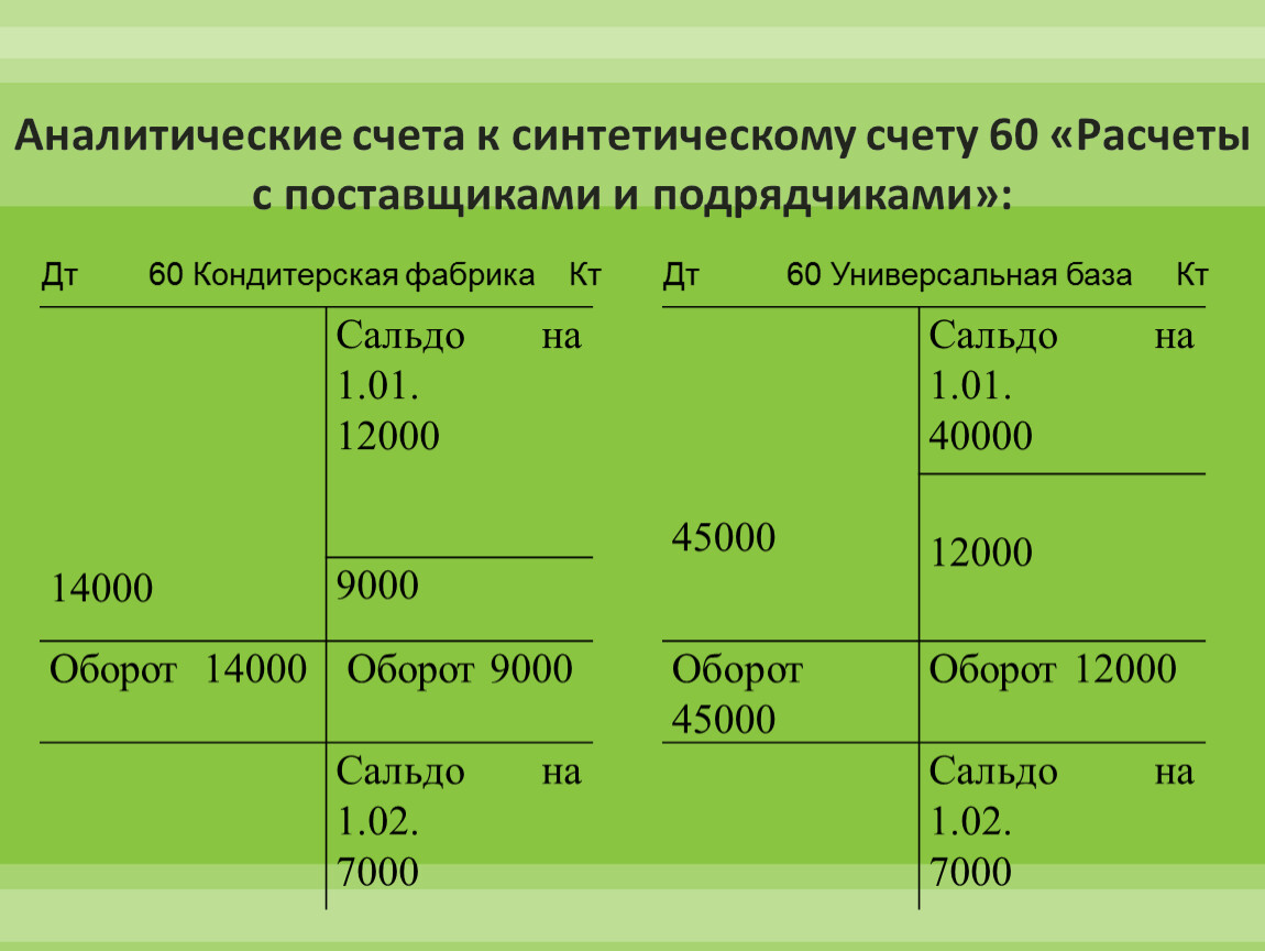Аналитические счета к синтетическому счету 60 «Расчеты с поставщиками и подрядчиками»:
