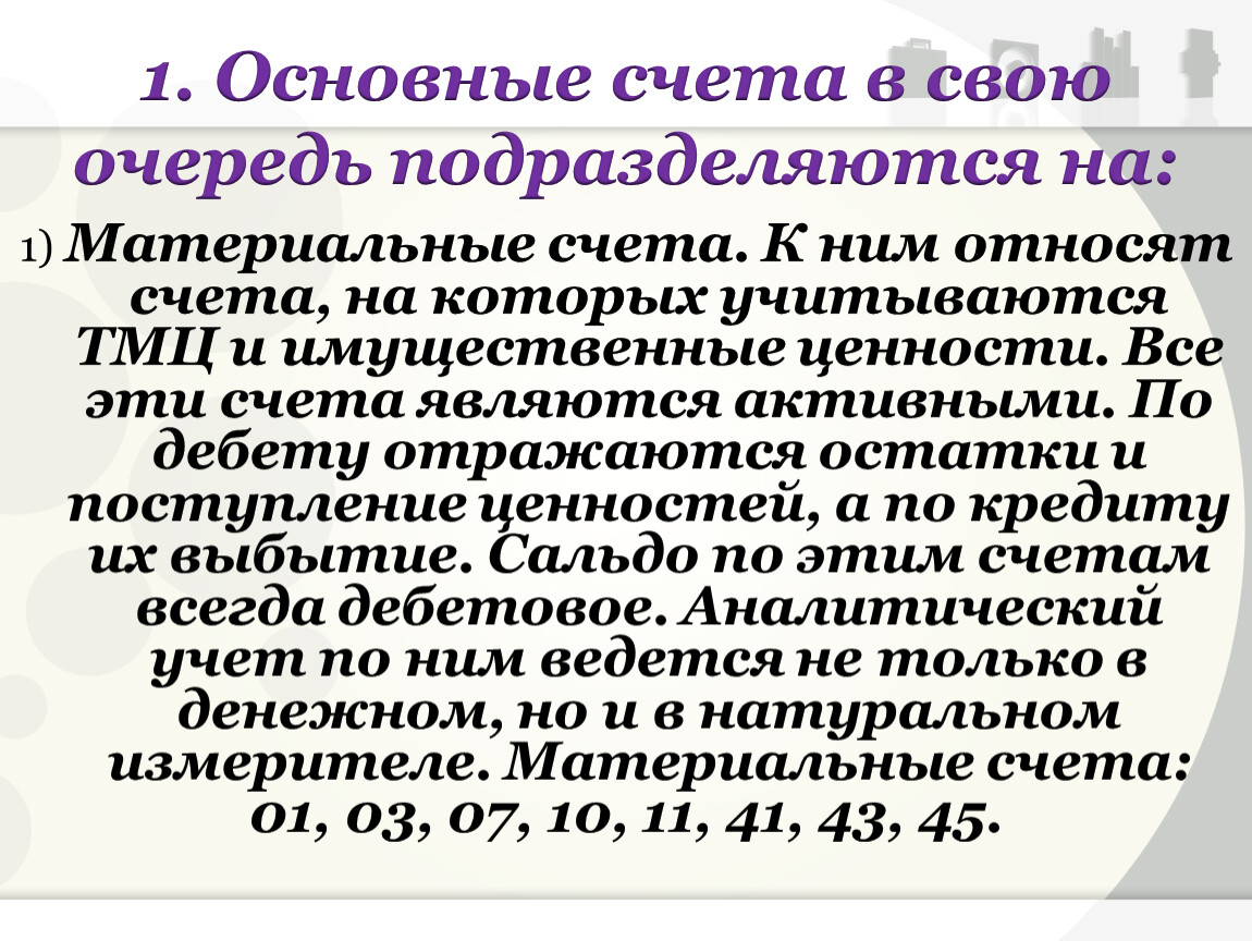 1) Материальные счета. К ним относят счета, на которых учитываются ТМЦ и имущественные ценности. Все эти счета являются активными. По дебету отражаются остатки и поступление ценностей, а по кредиту их выбытие. Сальдо по этим счетам всегда дебетовое. Аналитический учет по ним ведется не только в денежном, но и в натуральном измерителе. Материальные счета: