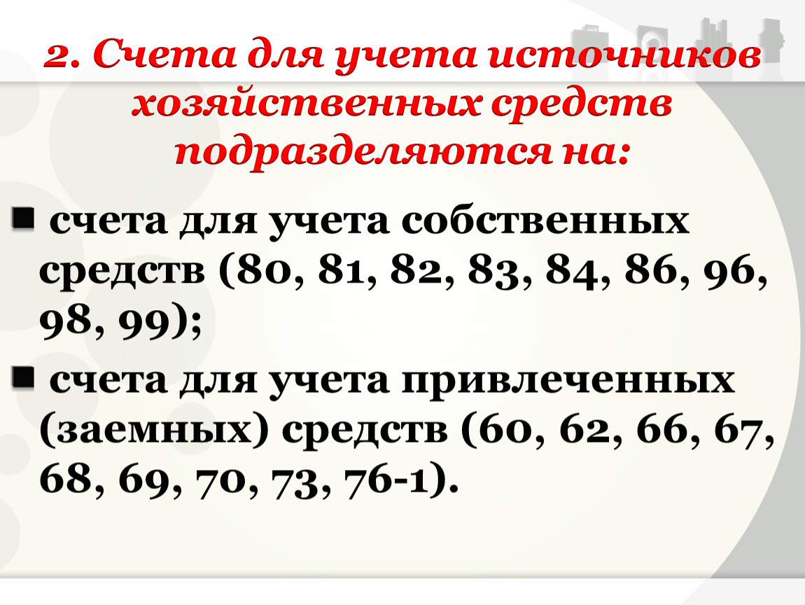 2. Счета для учета источников хозяйственных средств подразделяются на: