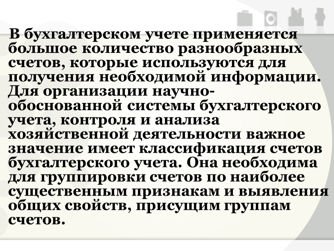 В бухгалтерском учете применяется большое количество разнообразных счетов, которые используются для получения необходимой информации. Для организации научно-обоснованной системы бухгалтерского учета, контроля и анализа хозяйственной деятельности важное значение имеет классификация счетов бухгалтерского учета. Она необходима для группировки счетов по наиболее существенным признакам и выявления общих свойств, присущим группам счетов.