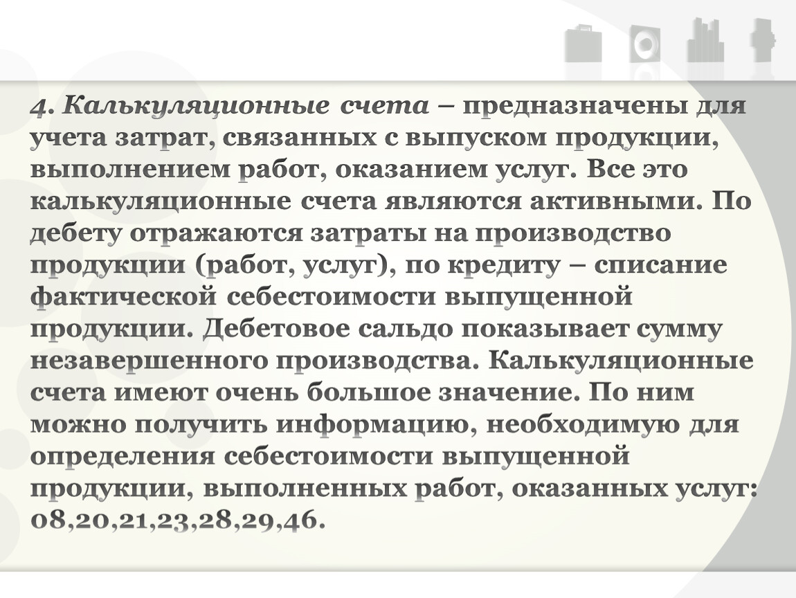 4. Калькуляционные счета – предназначены для учета затрат, связанных с выпуском продукции, выполнением работ, оказанием услуг. Все это калькуляционные счета являются активными. По дебету отражаются затраты на производство продукции (работ, услуг), по кредиту – списание фактической себестоимости выпущенной продукции. Дебетовое сальдо показывает сумму незавершенного производства. Калькуляционные счета имеют очень большое значение. По ним можно получить информацию, необходимую для определения себестоимости выпущенной продукции, выполненных работ, оказанных услуг: 08,20,21,23,28,29,46.