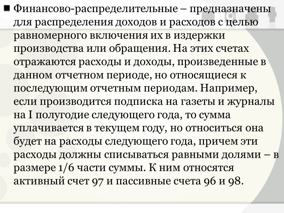 Финансово-распределительные – предназначены для распределения доходов и расходов с целью равномерного включения их в издержки производства или обращения. На этих счетах отражаются расходы и доходы, произведенные в данном отчетном периоде, но относящиеся к последующим отчетным периодам. Например, если производится подписка на газеты и журналы на I полугодие следующего года, то сумма уплачивается в текущем году, но относиться она будет на расходы следующего года, причем эти расходы должны списываться равными долями – в размере 1/6 части суммы. К ним относятся активный счет 97 и пассивные счета 96 и 98.