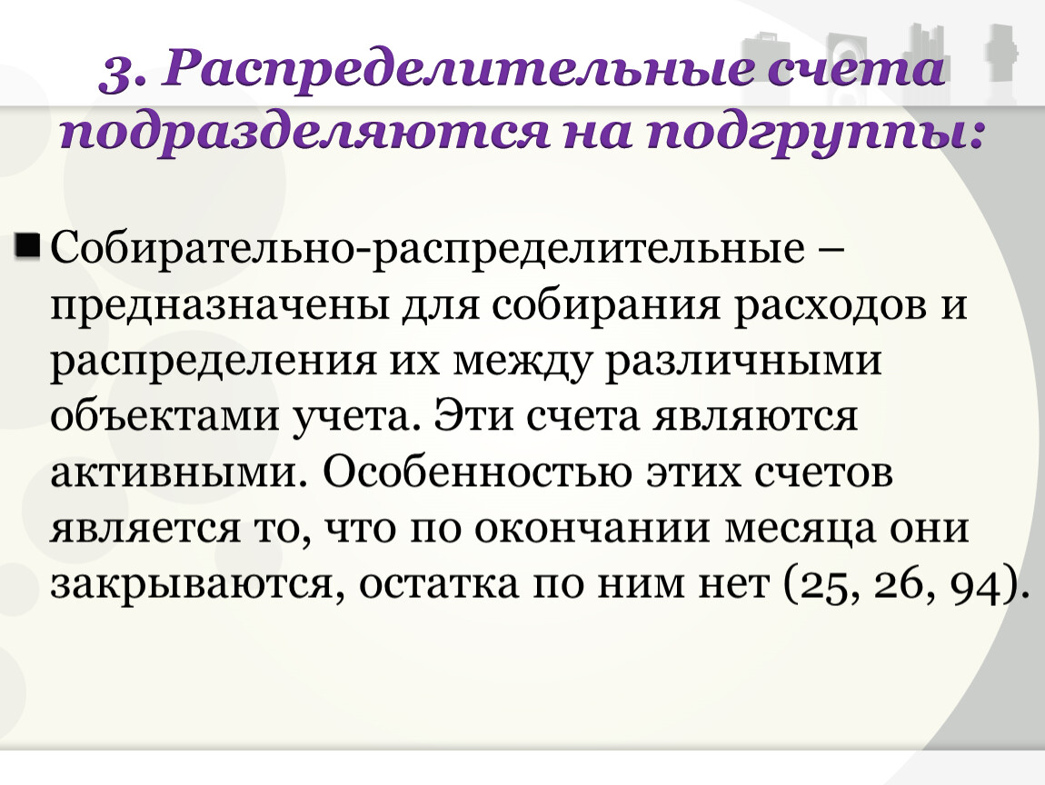 Собирательно-распределительные – предназначены для собирания расходов и распределения их между различными объектами учета. Эти счета являются активными. Особенностью этих счетов является то, что по окончании месяца они закрываются, остатка по ним нет (25, 26, 94).
