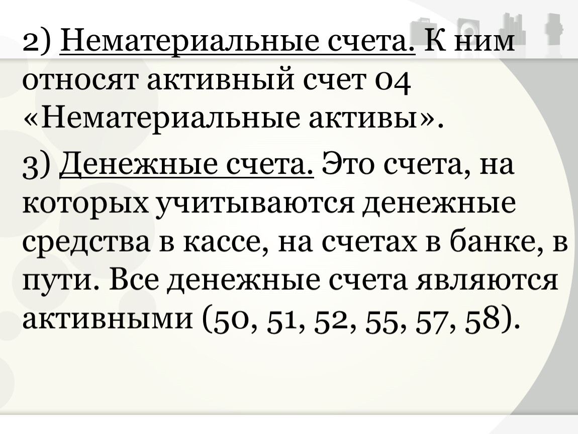 3) Денежные счета. Это счета, на которых учитываются денежные средства в кассе, на счетах в банке, в пути. Все денежные счета являются активными (50, 51, 52, 55, 57, 58).