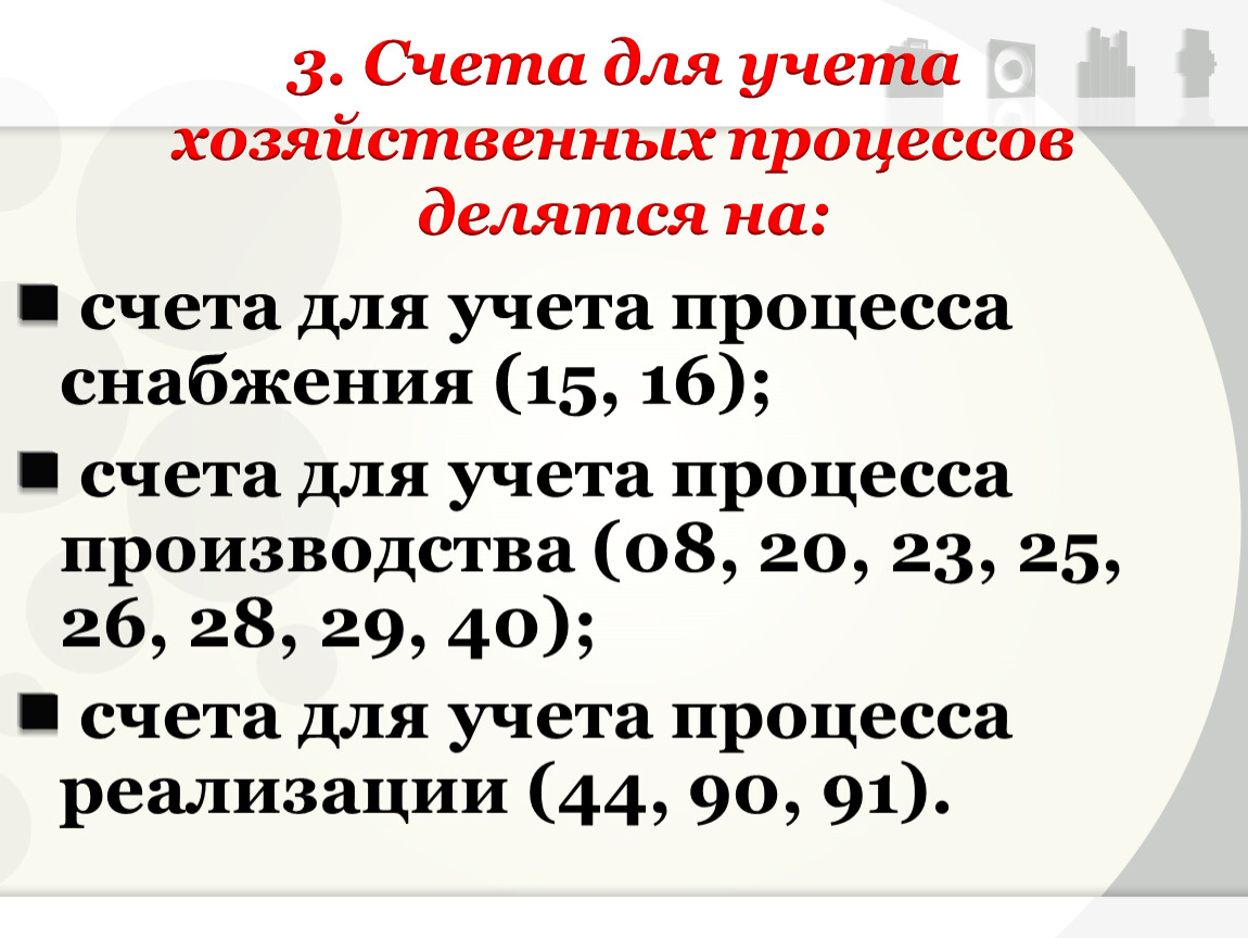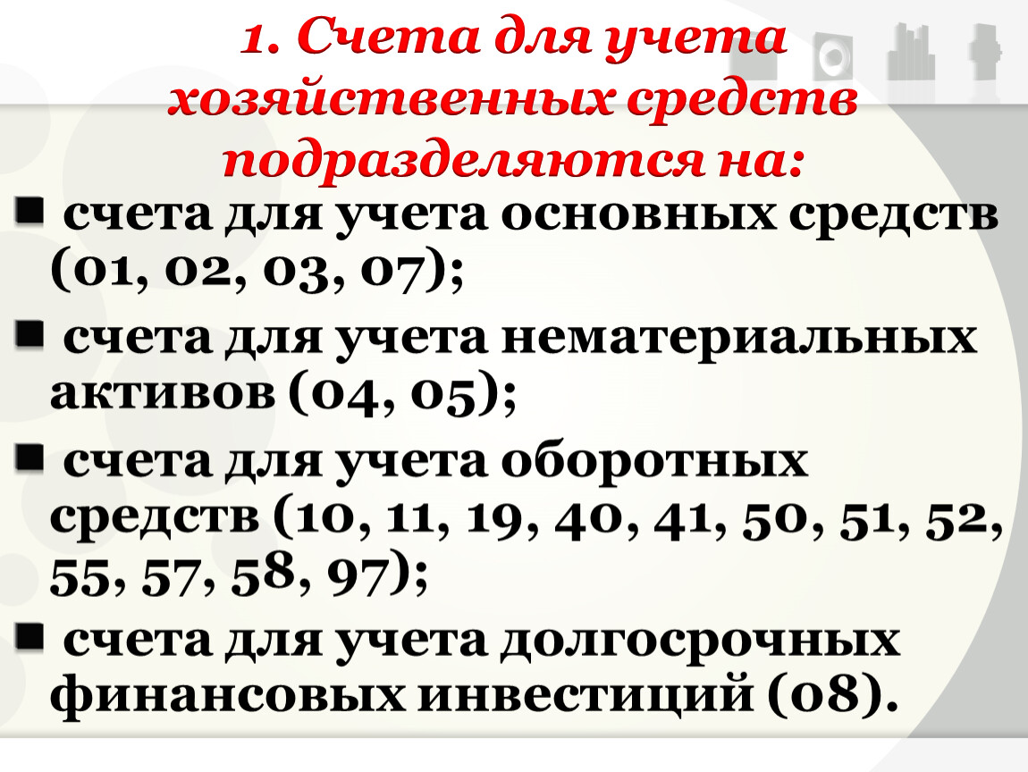 Счета для учета основных средств | Счета для учета нематериальных активов | Счета для учета оборотных средств | Счета для учета долгосрочных финансовых инвестиций | Счета для учета собственных средств | Счета для учета привлеченных (заемных) средств | Счета для учета процесса снабжения | Счета для учета процесса производства | Счета для учета процесса реализации |