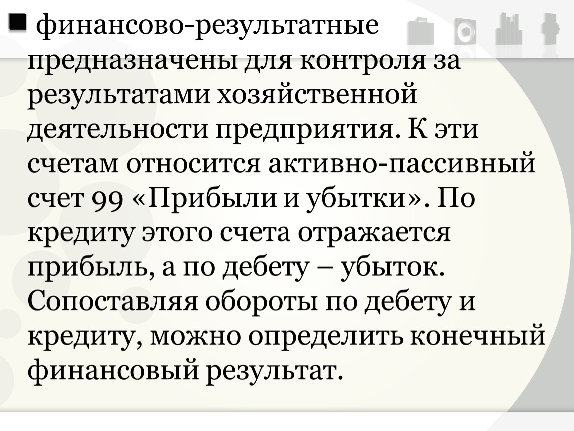 финансово-результатные предназначены для контроля за результатами хозяйственной деятельности предприятия. К эти счетам относится активно-пассивный счет 99 «Прибыли и убытки». По кредиту этого счета отражается прибыль, а по дебету – убыток. Сопоставляя обороты по дебету и кредиту, можно определить конечный финансовый результат.