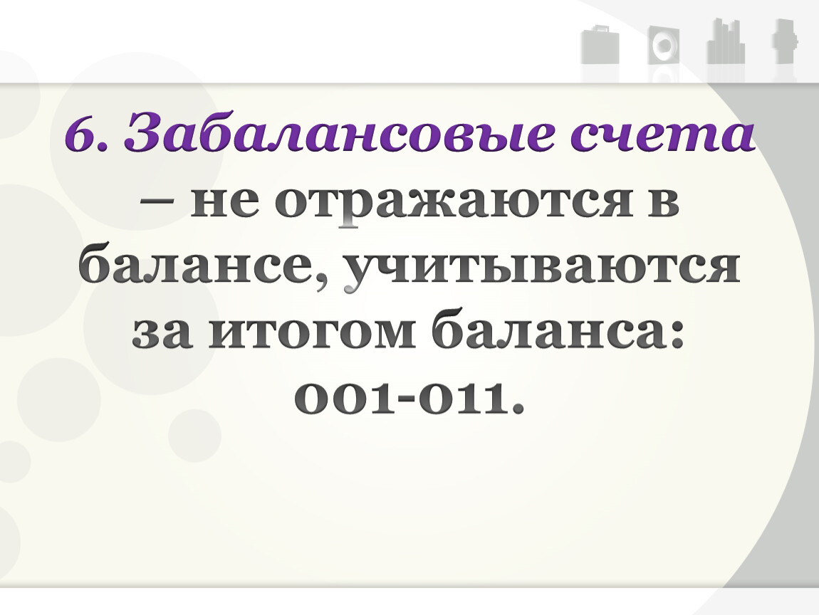 5) Счета для учета капитала. Это счета, на которых учитываются источники формирования собственных средств в виде собственного капитала и фондов. Все счета для учета капитала и фондов являются пассивными (80, 81, 82, 83, 84).