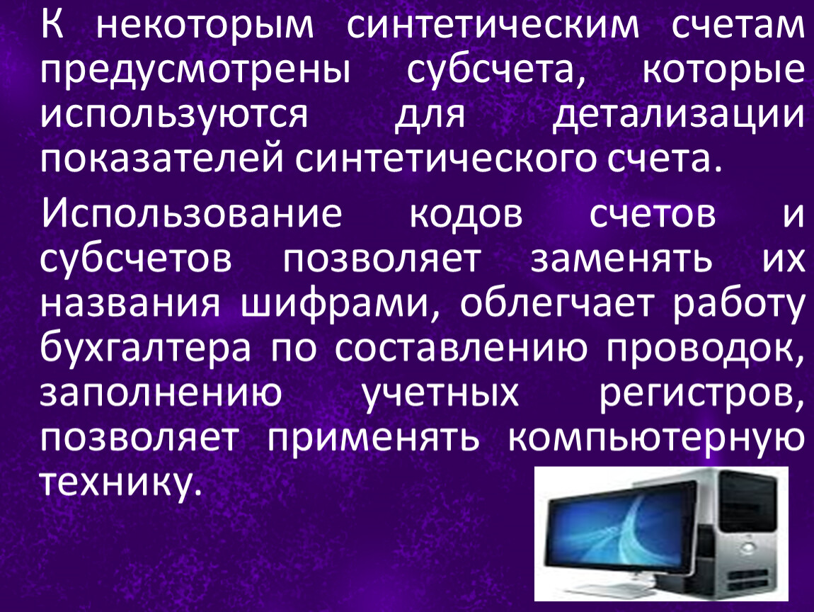 К некоторым синтетическим счетам предусмотрены субсчета, которые используются для детализации показателей синтетического счета.