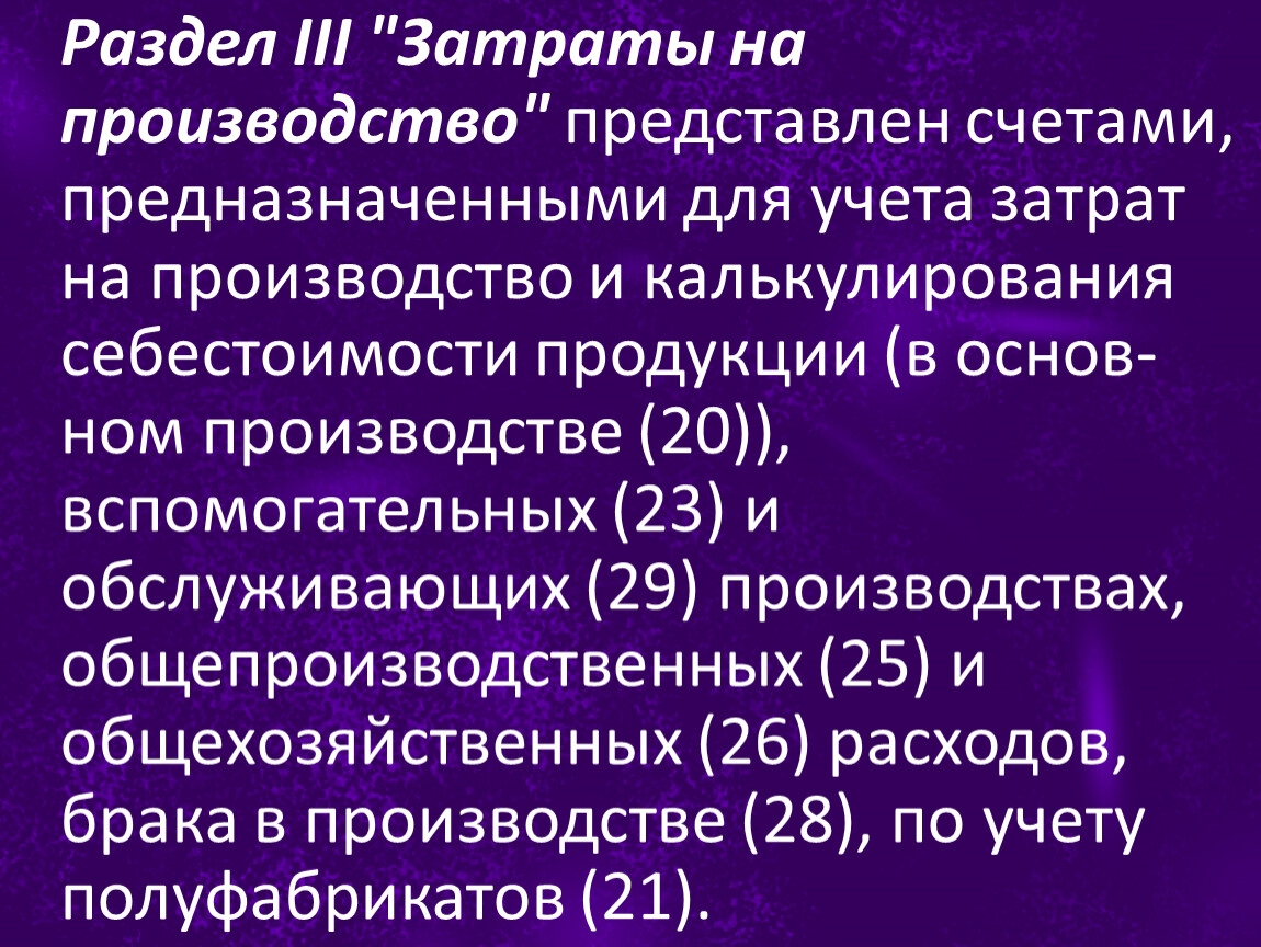Раздел III "Затраты на производство" представлен счетами, предназначенными для учета затрат на производство и калькулирования себестоимости продукции (в основ-ном производстве (20)), вспомогательных (23) и обслуживающих (29) производствах, общепроизводственных (25) и общехозяйственных (26) расходов, брака в производстве (28), по учету полуфабрикатов (21).