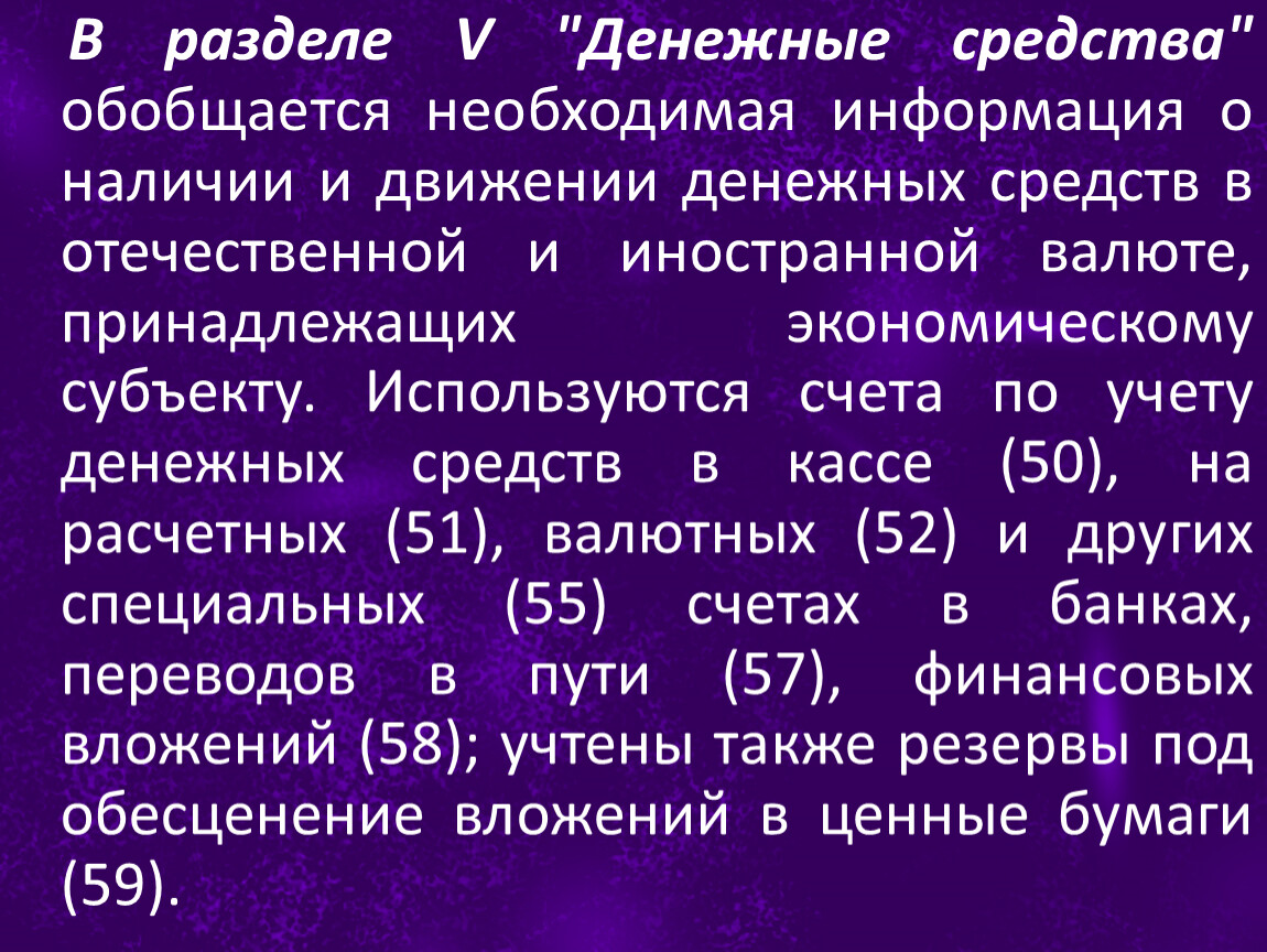 В разделе V "Денежные средства" обобщается необходимая информация о наличии и движении денежных средств в отечественной и иностранной валюте, принадлежащих экономическому субъекту. Используются счета по учету денежных средств в кассе (50), на расчетных (51), валютных (52) и других специальных (55) счетах в банках, переводов в пути (57), финансовых вложений (58); учтены также резервы под обесценение вложений в ценные бумаги (59).