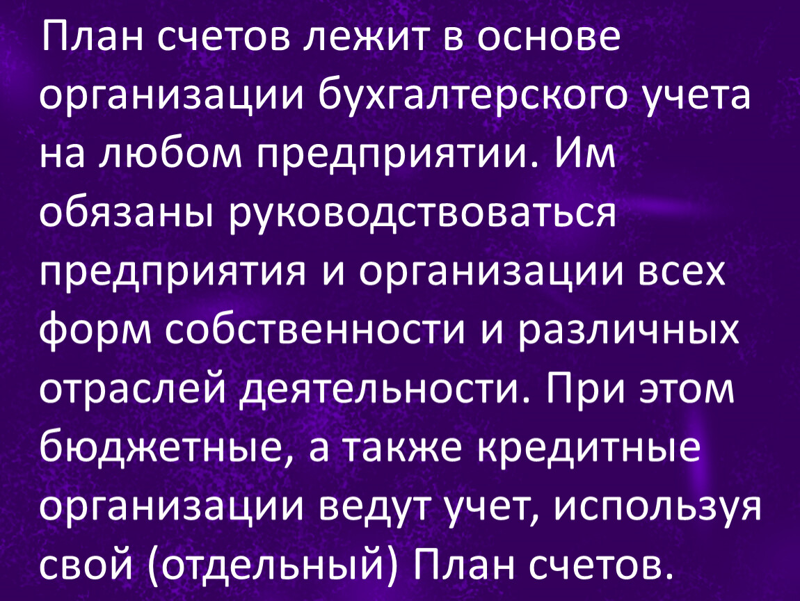 План счетов лежит в основе организации бухгалтерского учета на любом предприятии. Им обязаны руководствоваться предприятия и организации всех форм собственности и различных отраслей деятельности. При этом бюджетные, а также кредитные организации ведут учет, используя свой (отдельный) План счетов.