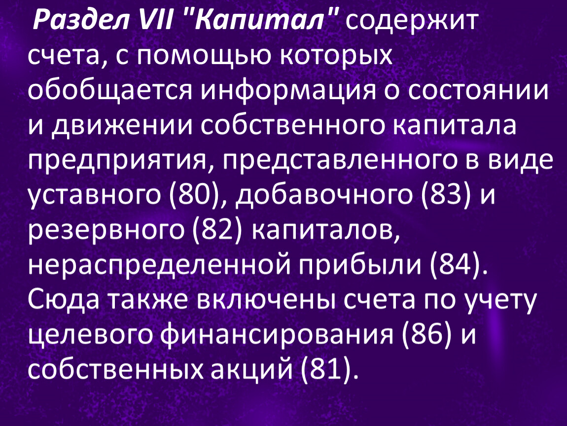 Раздел VII "Капитал" содержит счета, с помощью которых обобщается информация о состоянии и движении собственного капитала предприятия, представленного в виде уставного (80), добавочного (83) и резервного (82) капиталов, нераспределенной прибыли (84). Сюда также включены счета по учету целевого финансирования (86) и собственных акций (81).