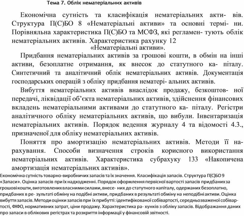 Економічна сутність та класифікація нематеріальних акти- вів. Структура П(С)БО 8 «Нематеріальні активи» та основні термі- ни. Порівняльна характеристика П(С)БО та МСФЗ, які регламен- тують облік нематеріальних активів. Характеристика рахунку 12