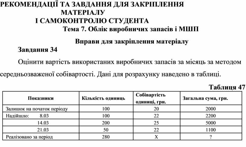Оцінити вартість використаних виробничих запасів за місяць за методом середньозваженої собівартості. Дані для розрахунку наведено в таблиці.