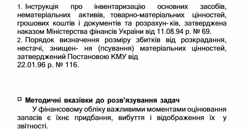 5. Інструкція про інвентаризацію основних засобів, нематеріальних активів, товарно-матеріальних цінностей, грошових коштів і документів та розрахун- ків, затверджена наказом Міністерства фінансів України від 11.08.94 р. № 69.