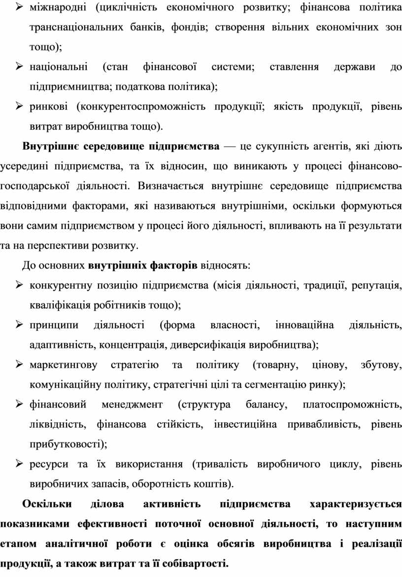 Ø конкурентну позицію підприємства (місія діяльності, традиції, репутація, кваліфікація робітників тощо);