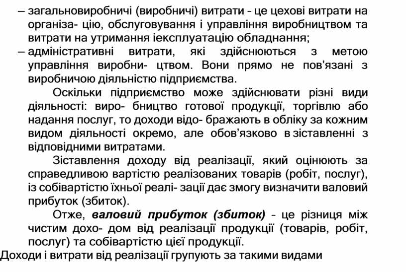 Зіставлення доходу від реалізації, який оцінюють за справедливою вартістю реалізованих товарів (робіт, послуг), із собівартістю їхньої реалі- зації дає змогу визначити валовий прибуток (збиток).