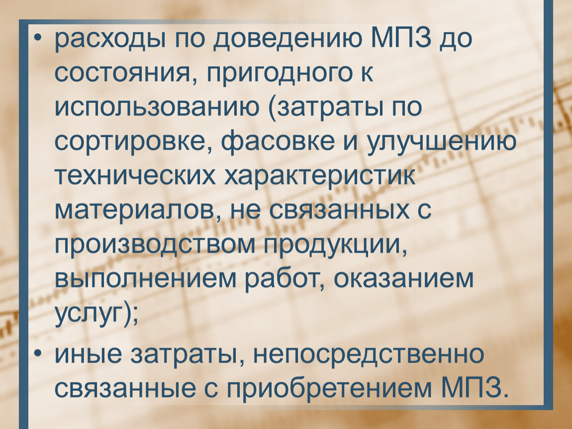 расходы по доведению МПЗ до состояния, пригодного к использованию (затраты по сортировке, фасовке и улучшению технических характеристик материалов, не связанных с производством продукции, выполнением работ, оказанием услуг);