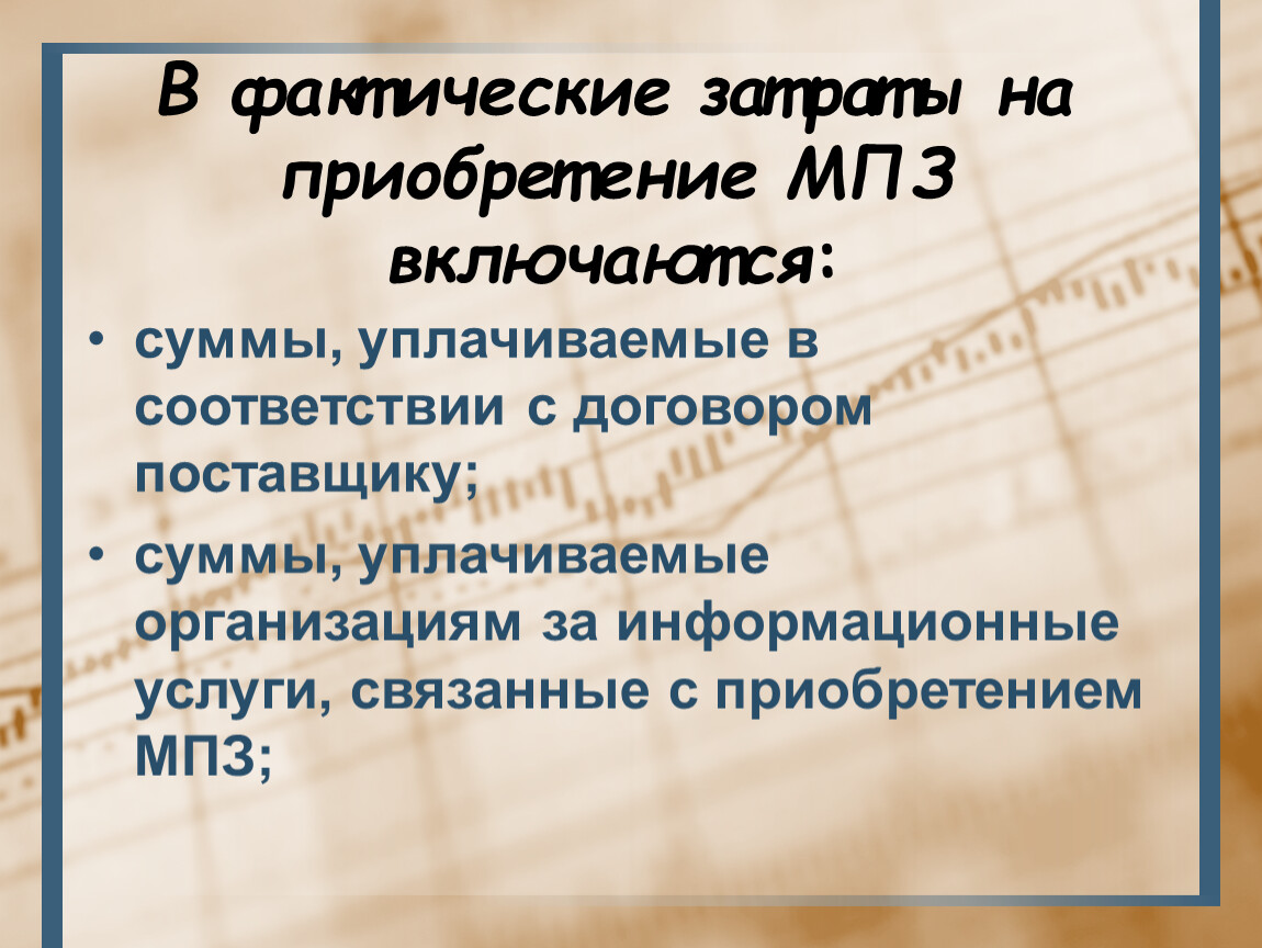 иные затраты, непосредственно связанные с приобретением МПЗ.