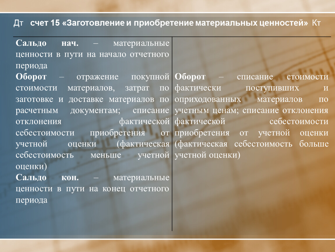 Дт счет 15 «Заготовление и приобретение материальных ценностей» Кт