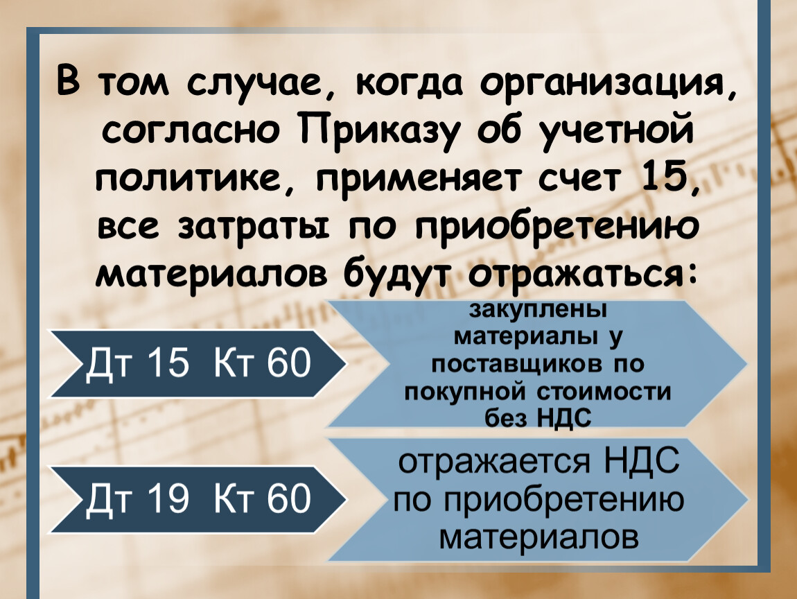 В том случае, когда организация, согласно Приказу об учетной политике, применяет счет 15, все затраты по приобретению материалов будут отражаться: